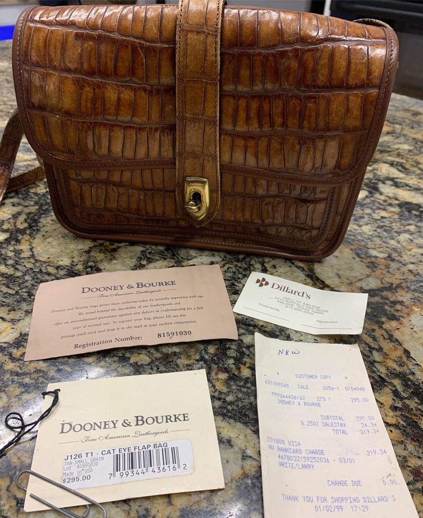 When I got home and pulled the tag out, I was shocked at how much that bag cost the original owner when she purchased it. She paid $319 😳…back then that was a lot of money and today it still is too, especially for a small little bag…. I thought, “wow that women spent all that money for this bag just for her daughter to sell it for $3.” The reality is that with time, that $300 bag just depreciated over time.